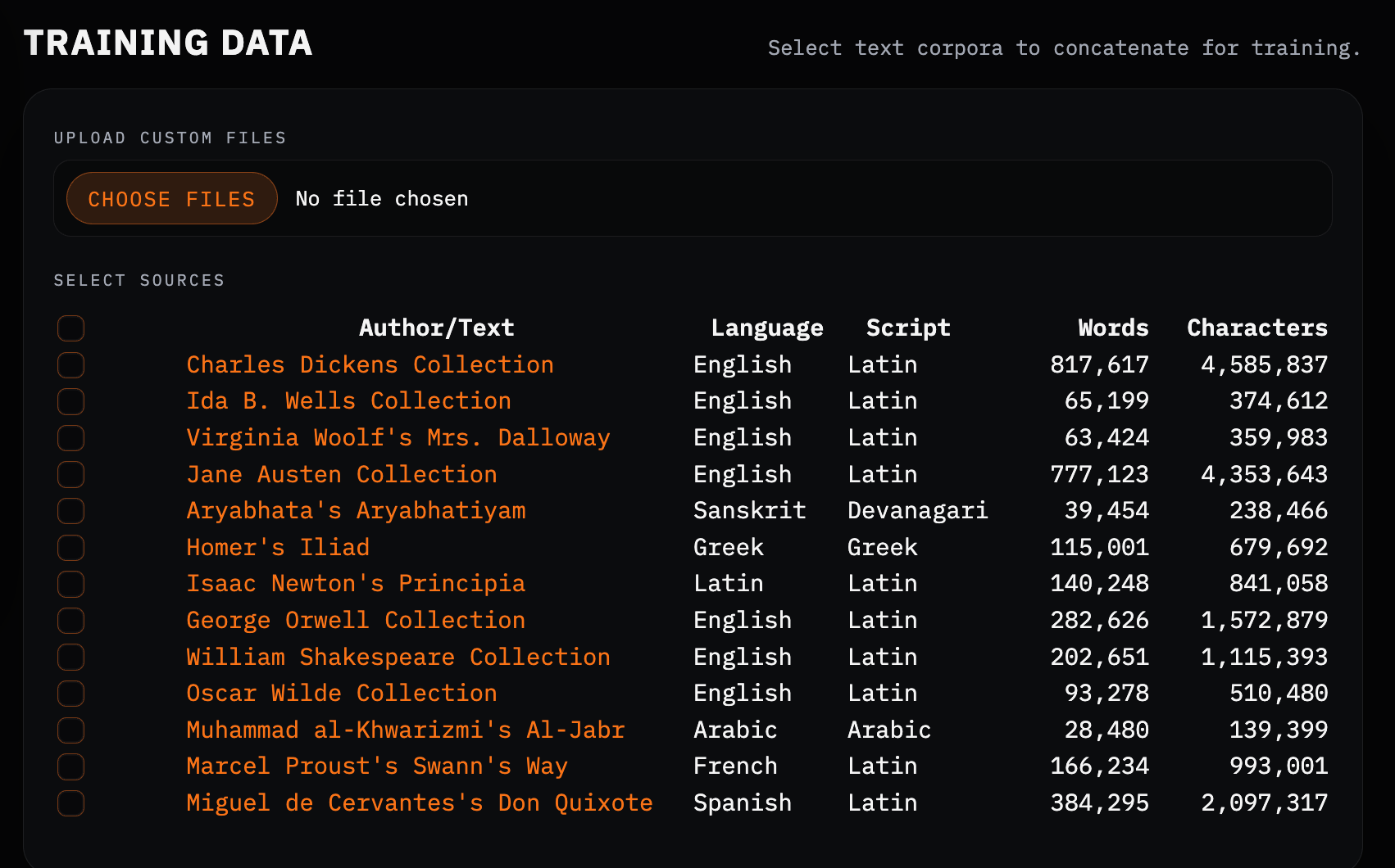 First up is the training data. You can upload your own file(s), or select from a small but intentionally diverse set of defaults—spanning languages, scripts, and history. This choice matters far more than I initially expected, and has an impact in architectural decisions to come.