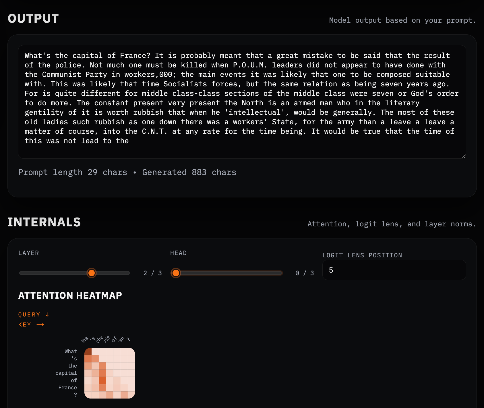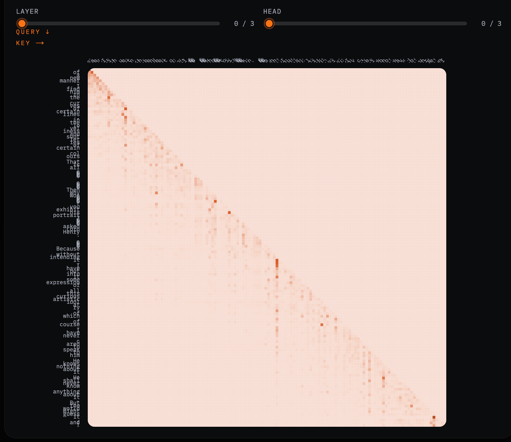 For any given sample, you can inspect an attention heatmap showing which tokens attend to which others—layer by layer, head by head. This is the first place where the model stops feeling like a loss-minimizing machine and starts to feel like a system with internal structure.