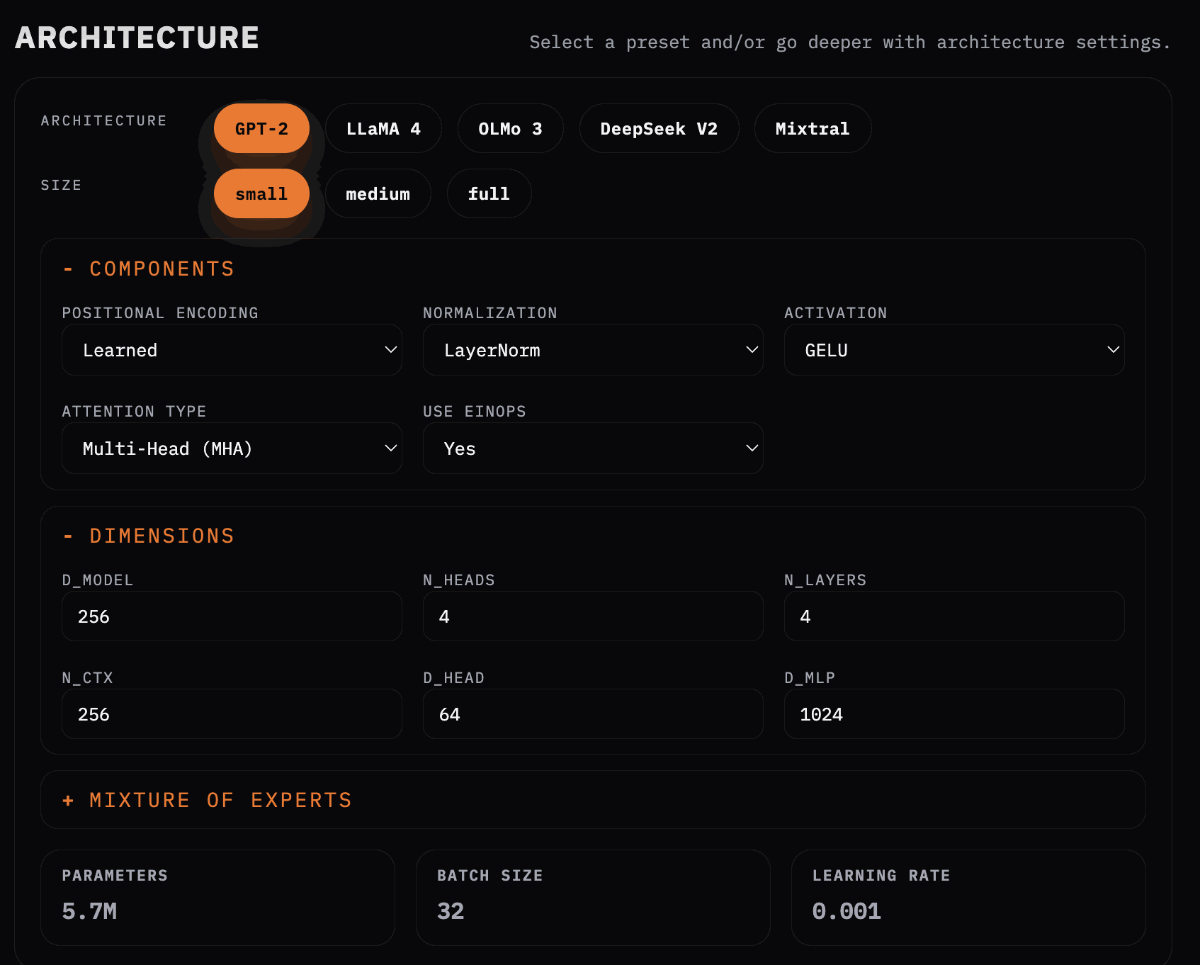 I included presets that roughly match canonical designs. GPT-2, as those who’ve watched Karpathy’s walkthroughs will know, uses learned positional encodings rather than RoPE, LayerNorm rather than RMSNorm, and GELU instead of SwiGLU. LLaMA makes different—and in many cases more elegant—choices. Its attention mechanism is also more efficient (Multi-Query Attention), and modern variants introduce Mixture-of-Experts layers in the MLP blocks.